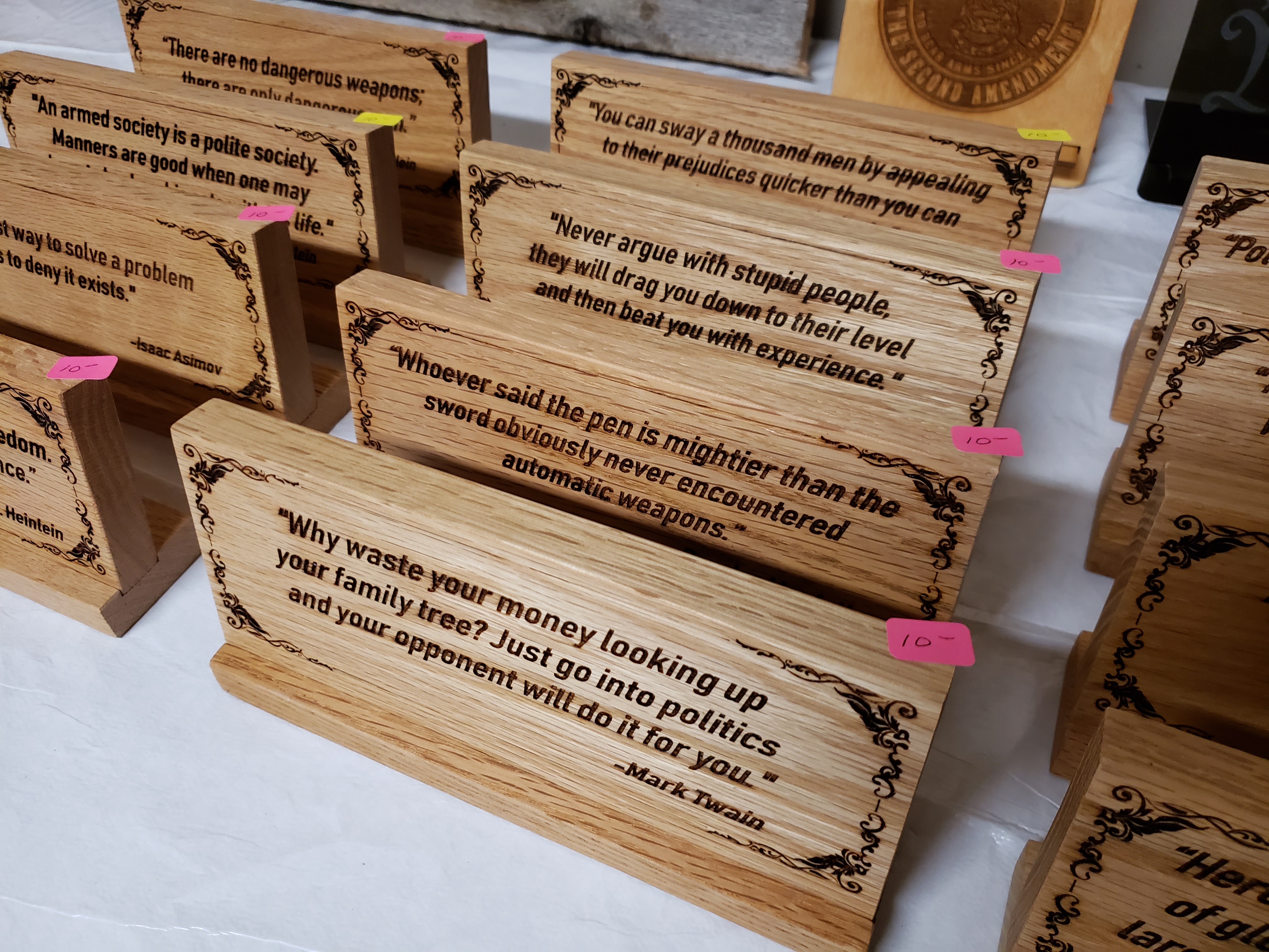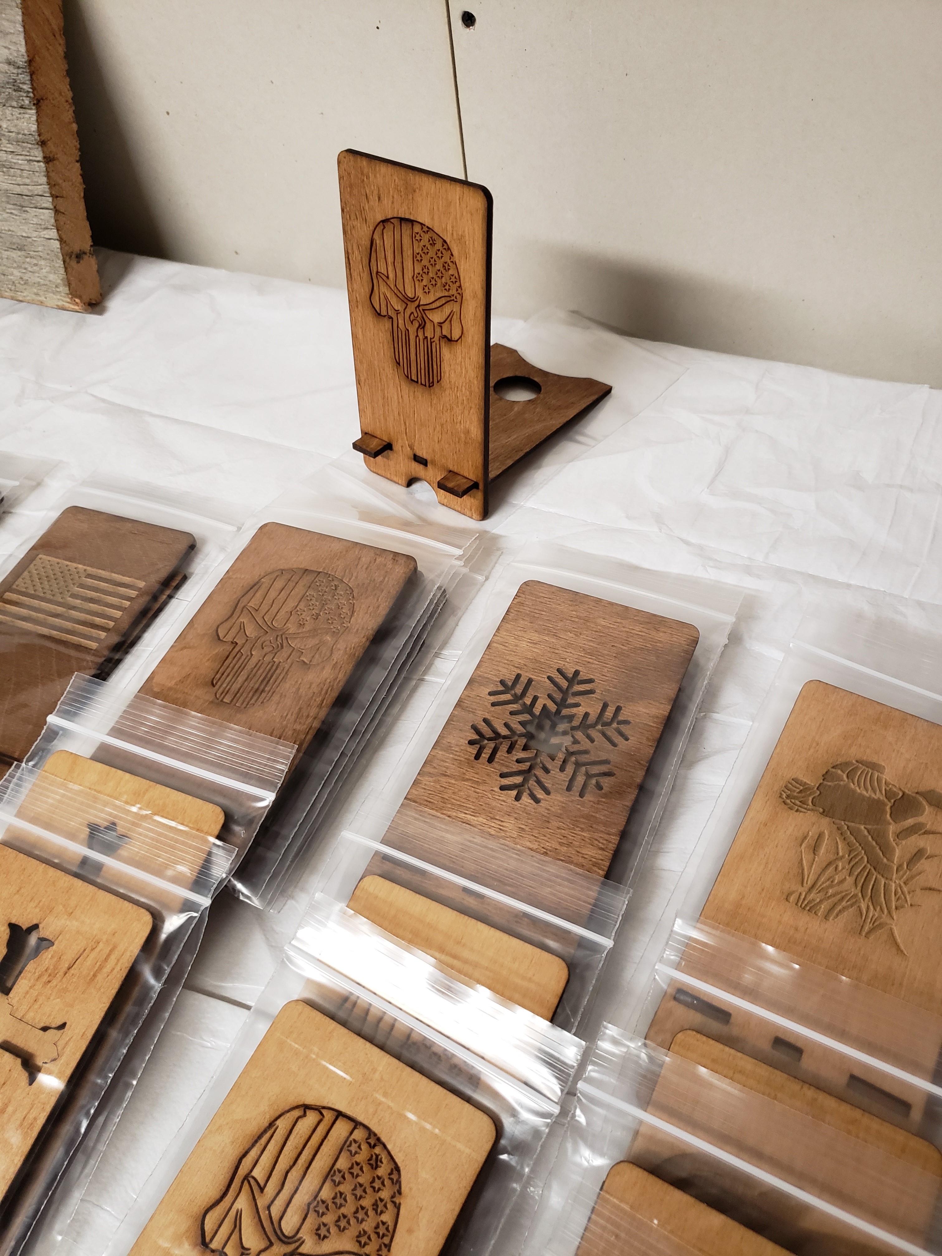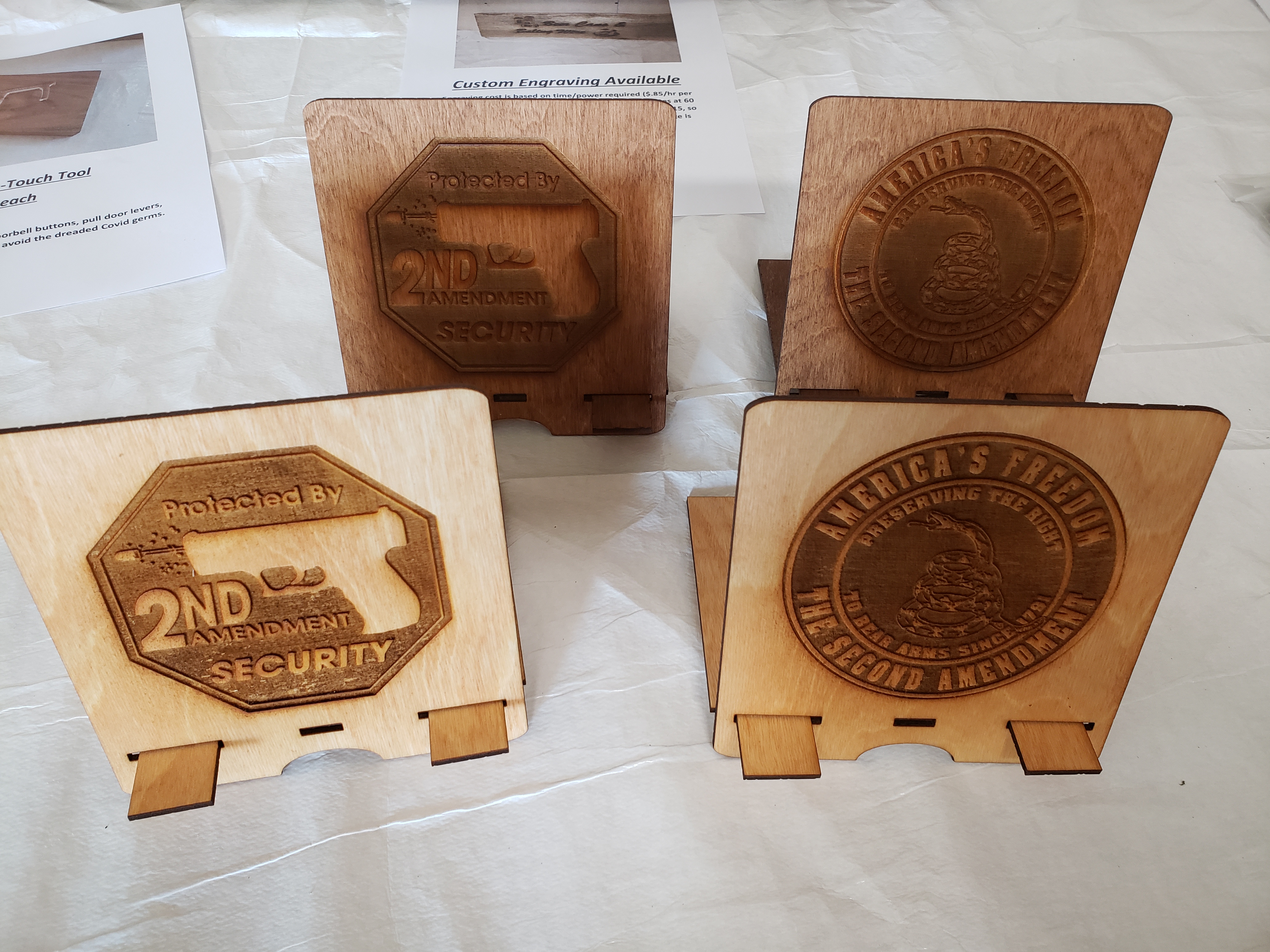 Various etchings, cutouts, and stains to choose from. Can be customized in quantity with your company name/logo. | ![]() ![]() |